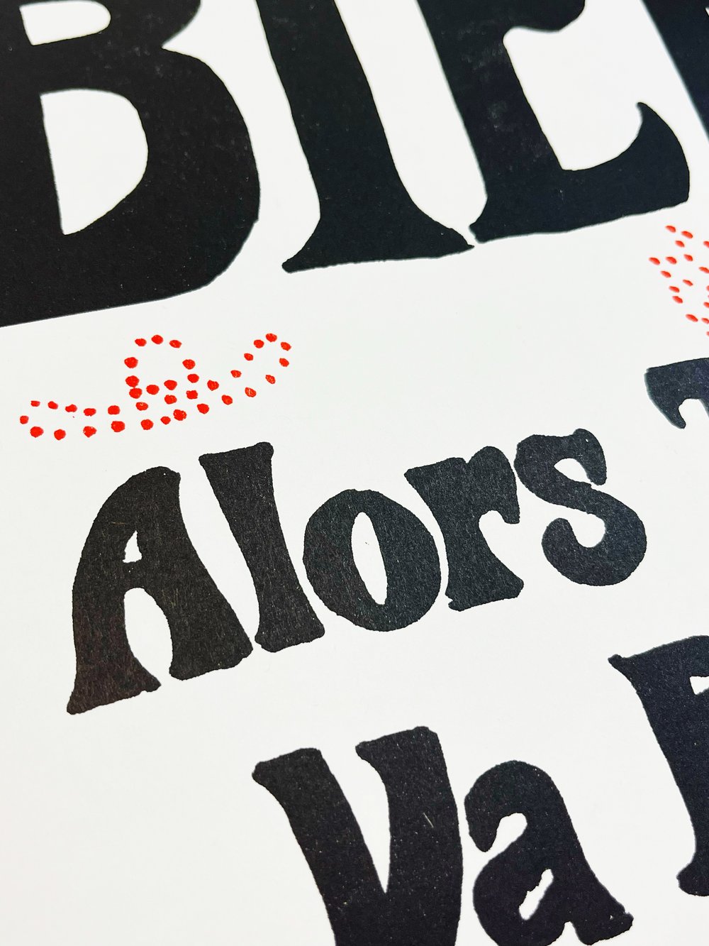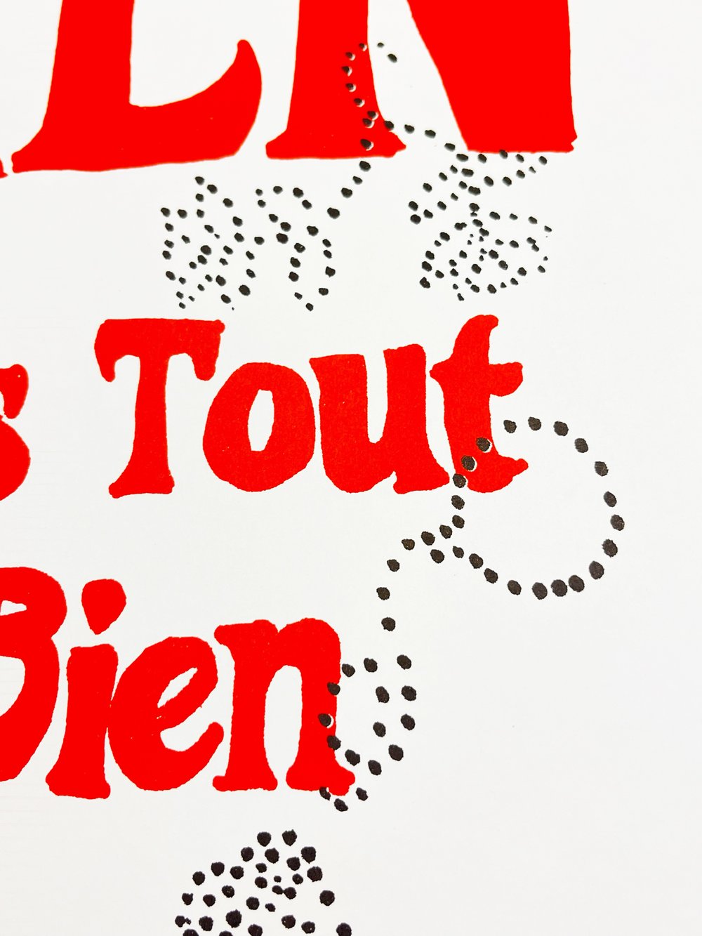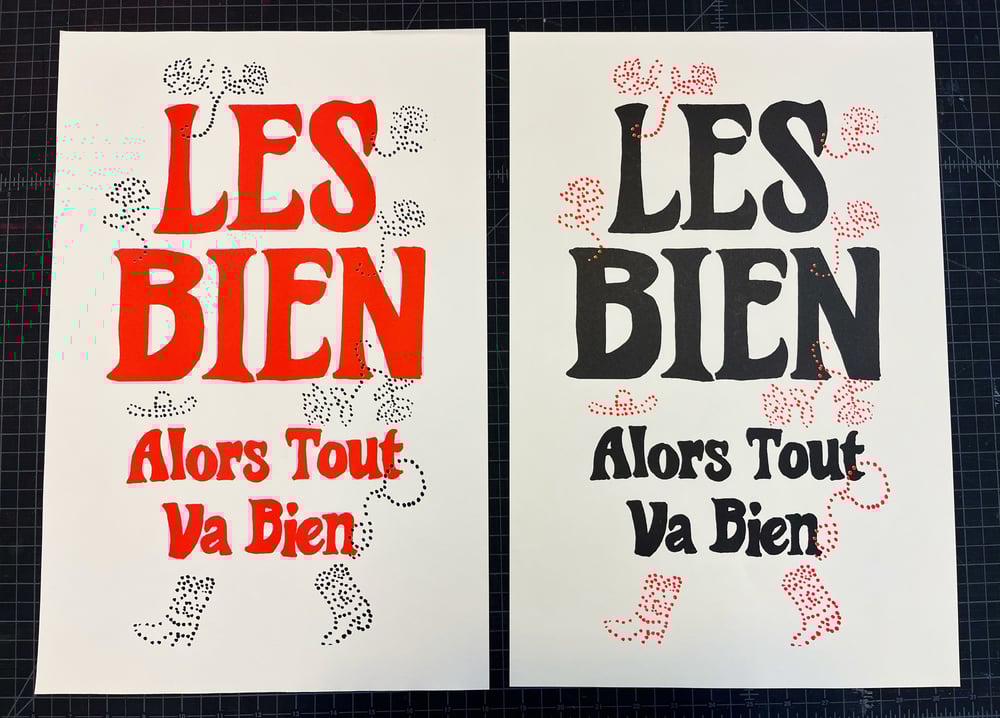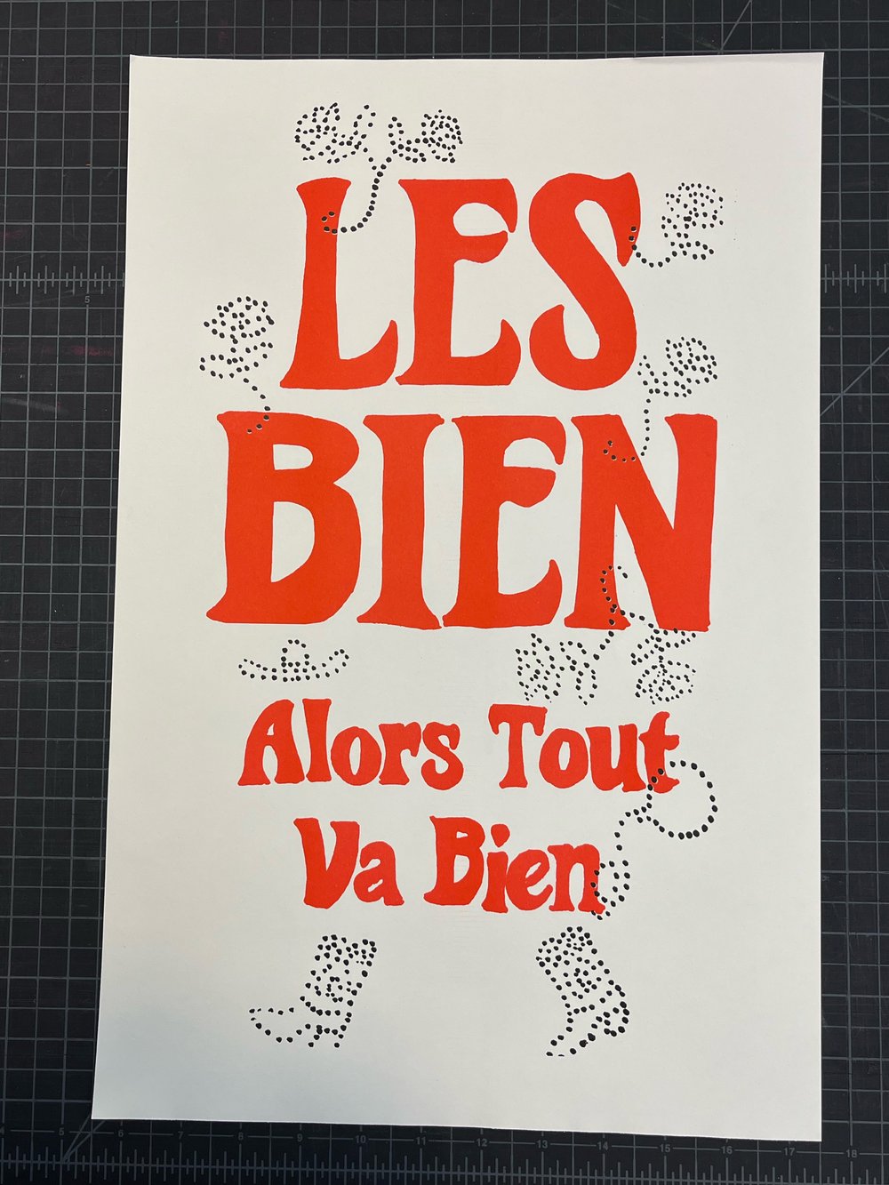 12x18 riso printed poster with a design based on wmn zine editor Sara Duell's dyke March banner "Les Bien - alors tout va bien". A play on words which loosely translates to "the good (lesbians) therefore everything is good".
